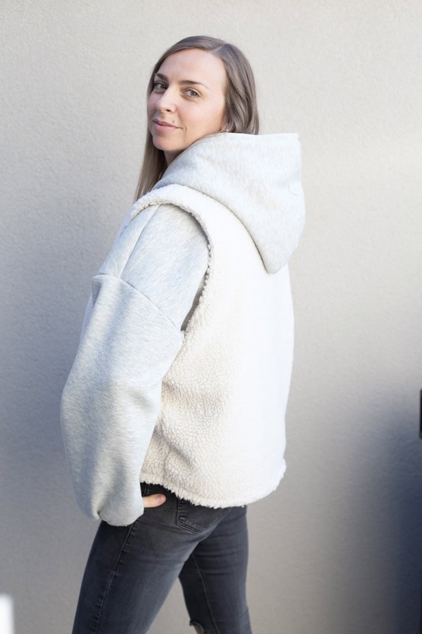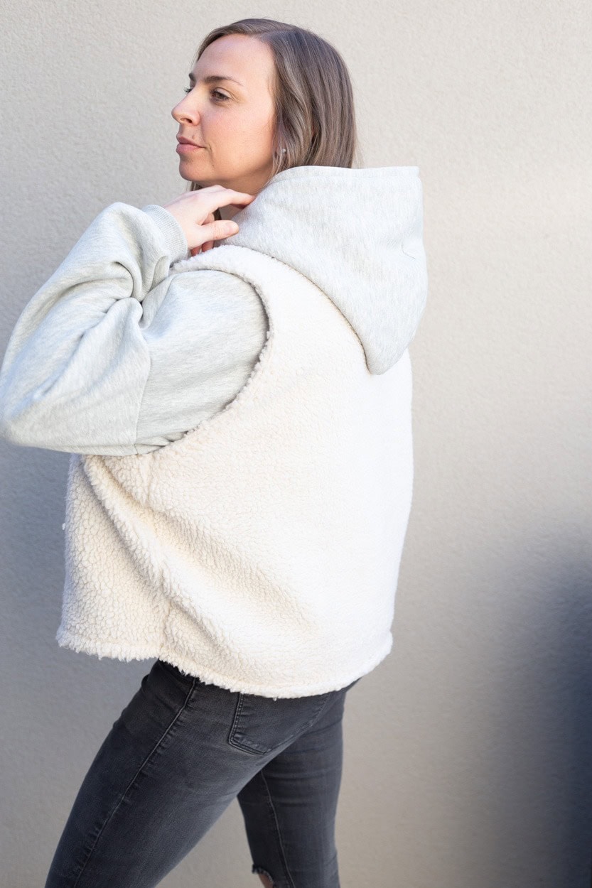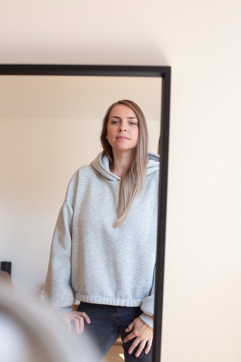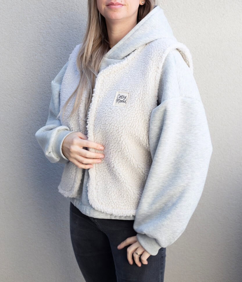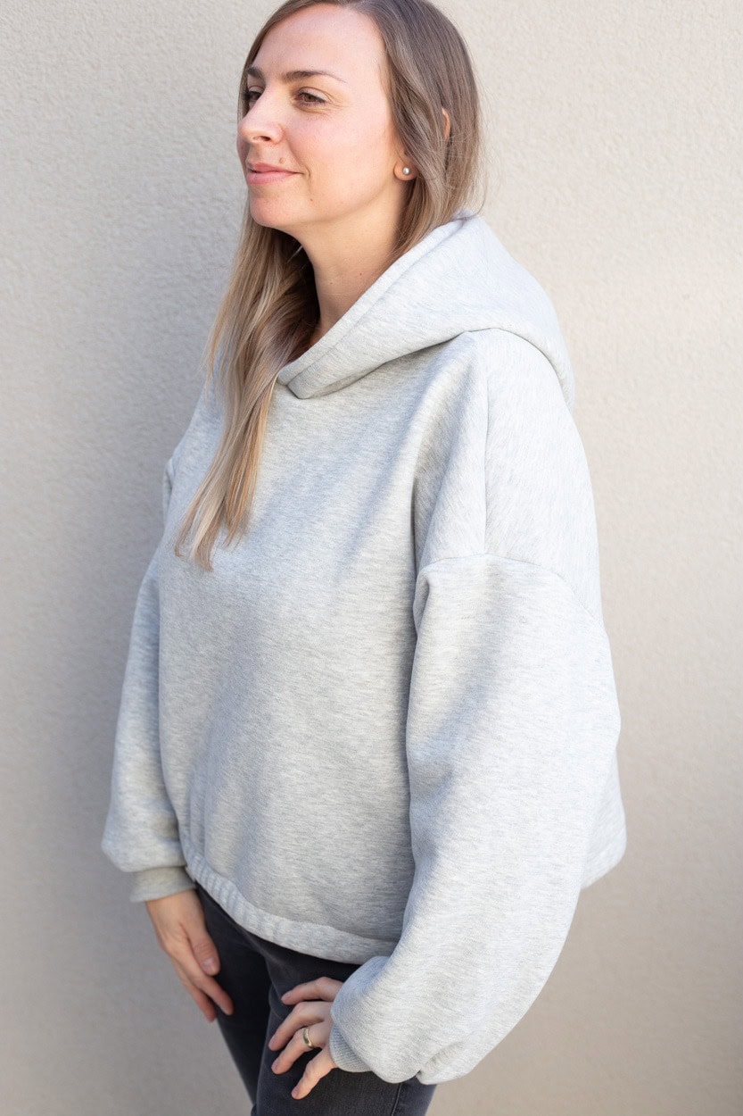 Der Hoodie fällt oversize aus und hat weite Ballonärmel. Der Stoff ist innen flauschig. Getragen wird auf den Bildern eine Gr. L in der normalen Länge, bei einer Körpergröße von 1,69m.