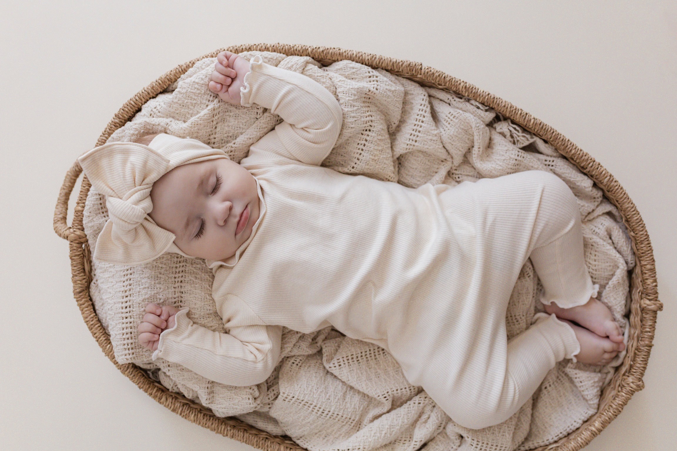 Der Jumpsuit für Mädchen hat an Hals, Ärmeln und Beinchen eine hübsche Rüschennaht. Auf den Bilder trägt Ilvy einen leichten sehr dehnbaren Ribstoff in der Farbe natur.