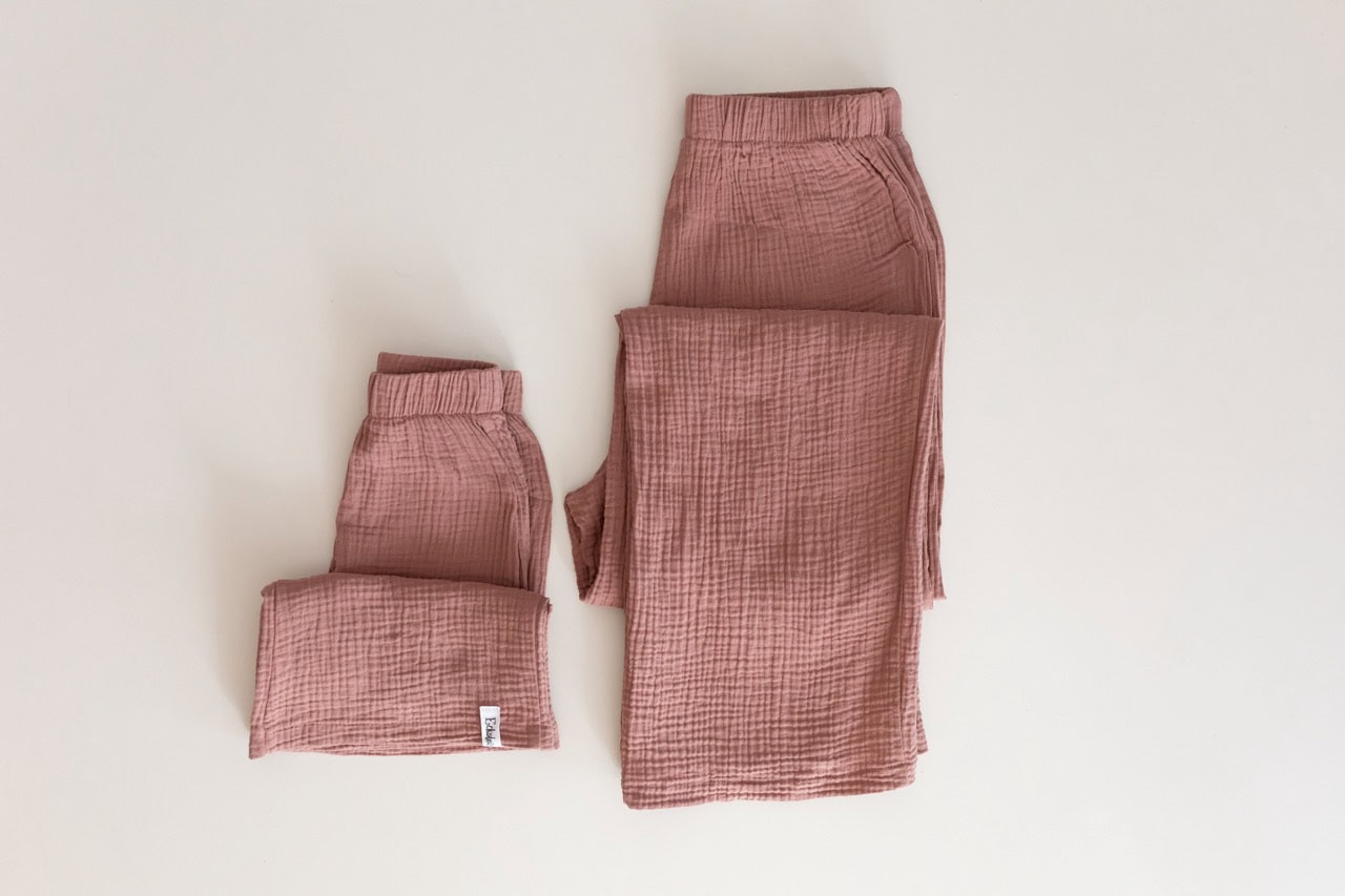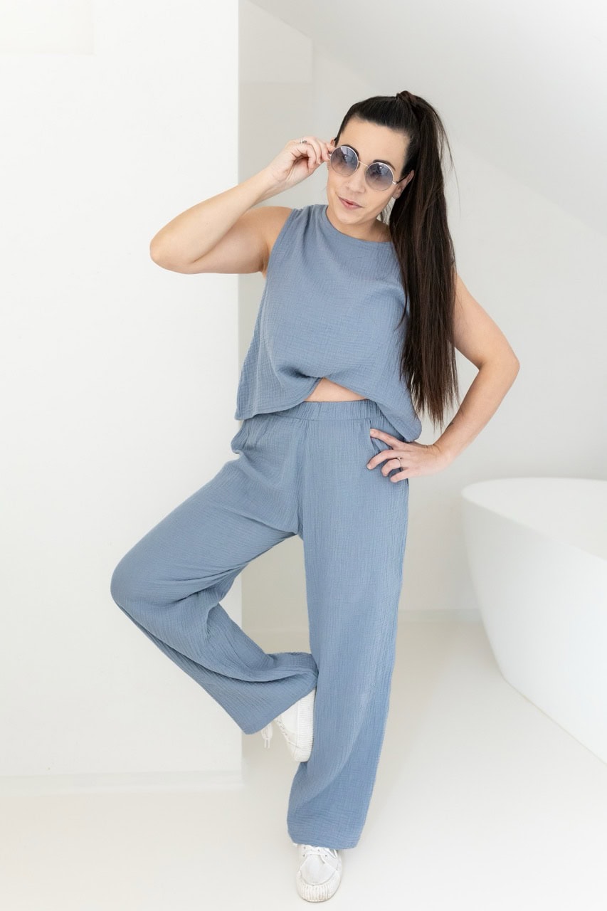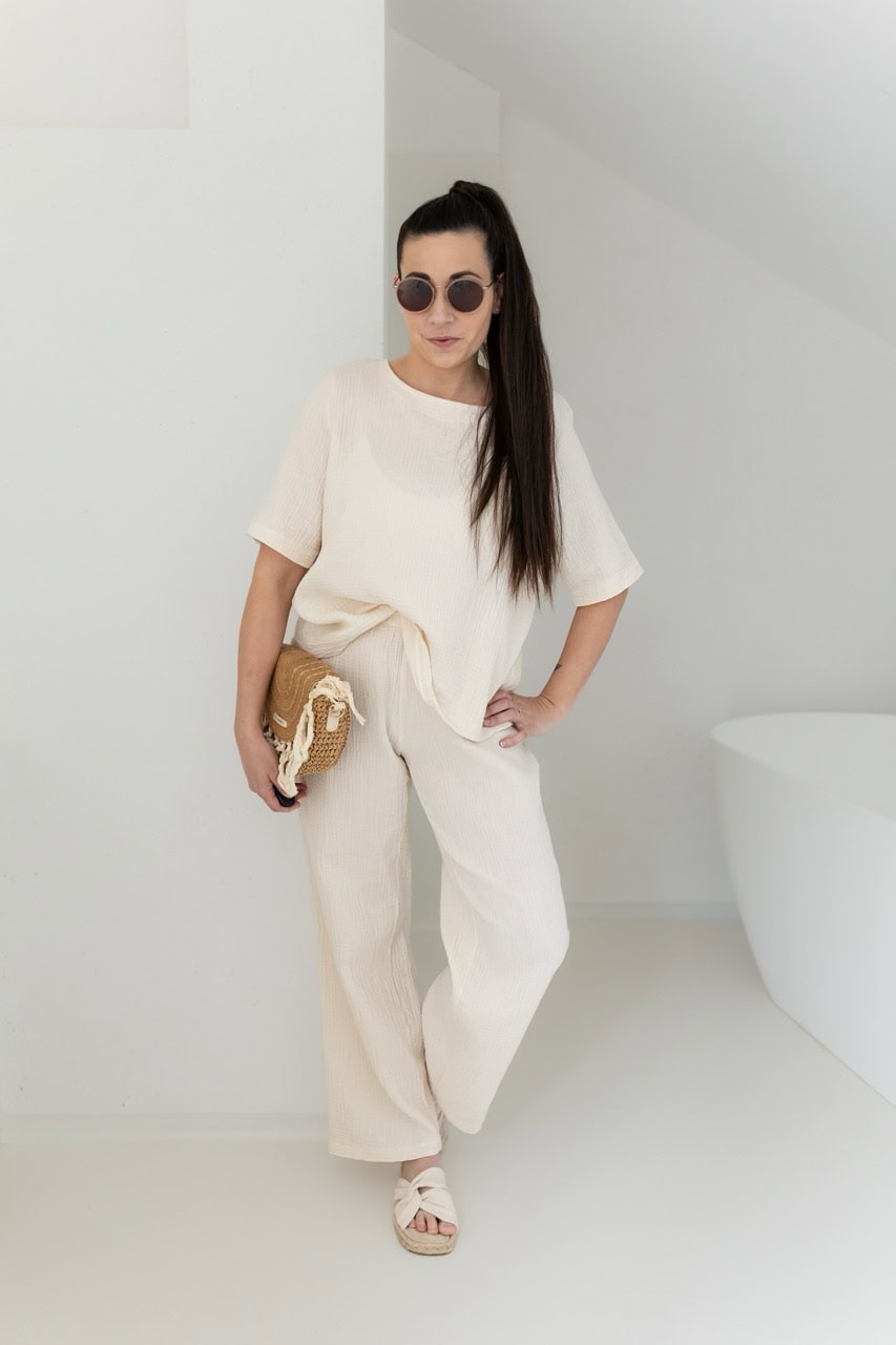 Die lockere Musselin Hose ist perfekt für warme Sommertage, kann aber auch jetzt und im Herbst schon gut getragen werden.