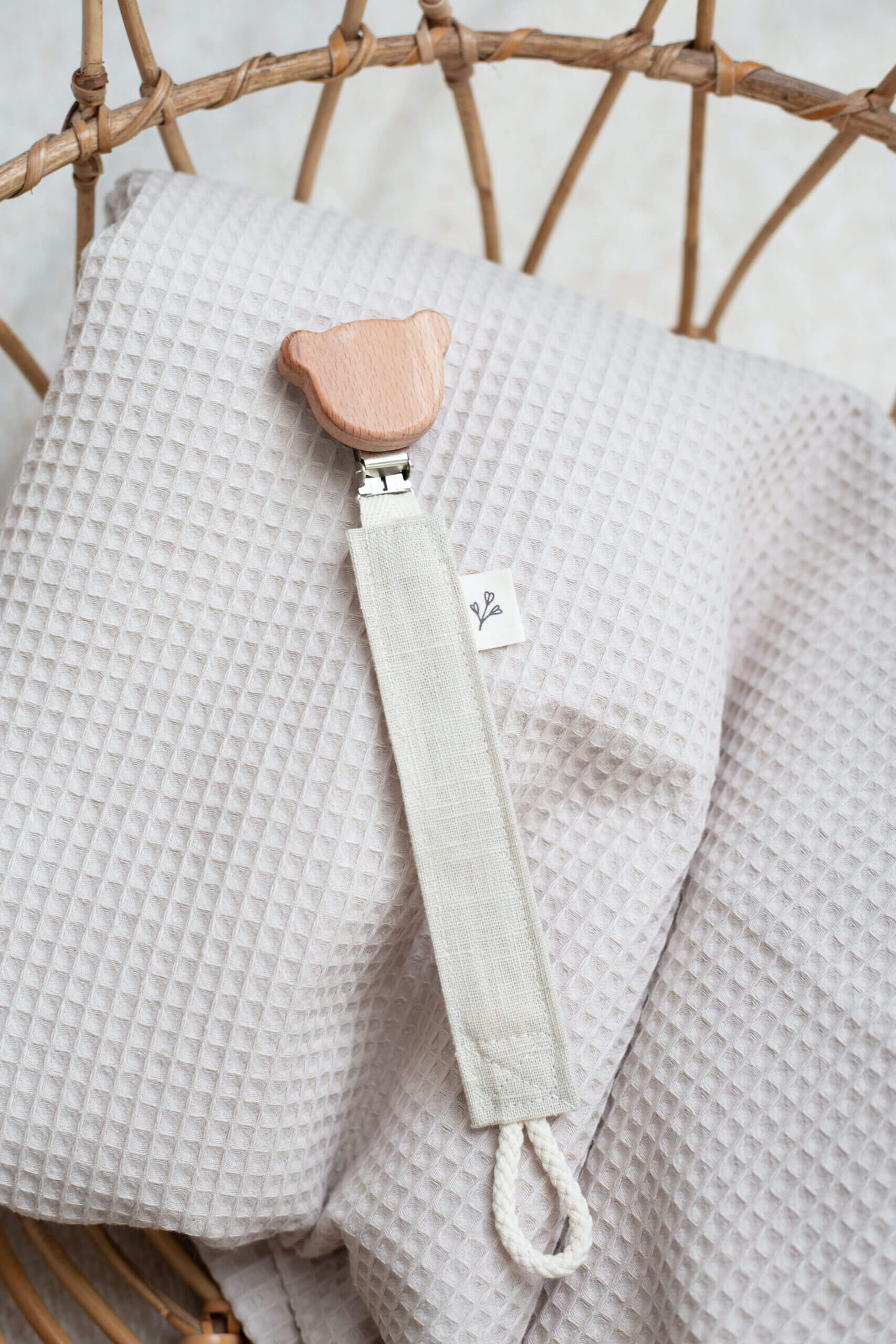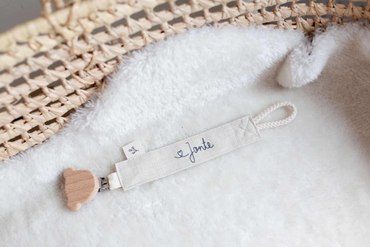 Schnullerband aus hochwertigem Leinenstoff. Auf Wunsch mit Personalisierung.