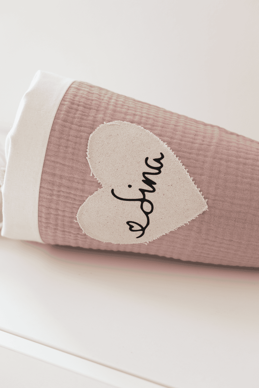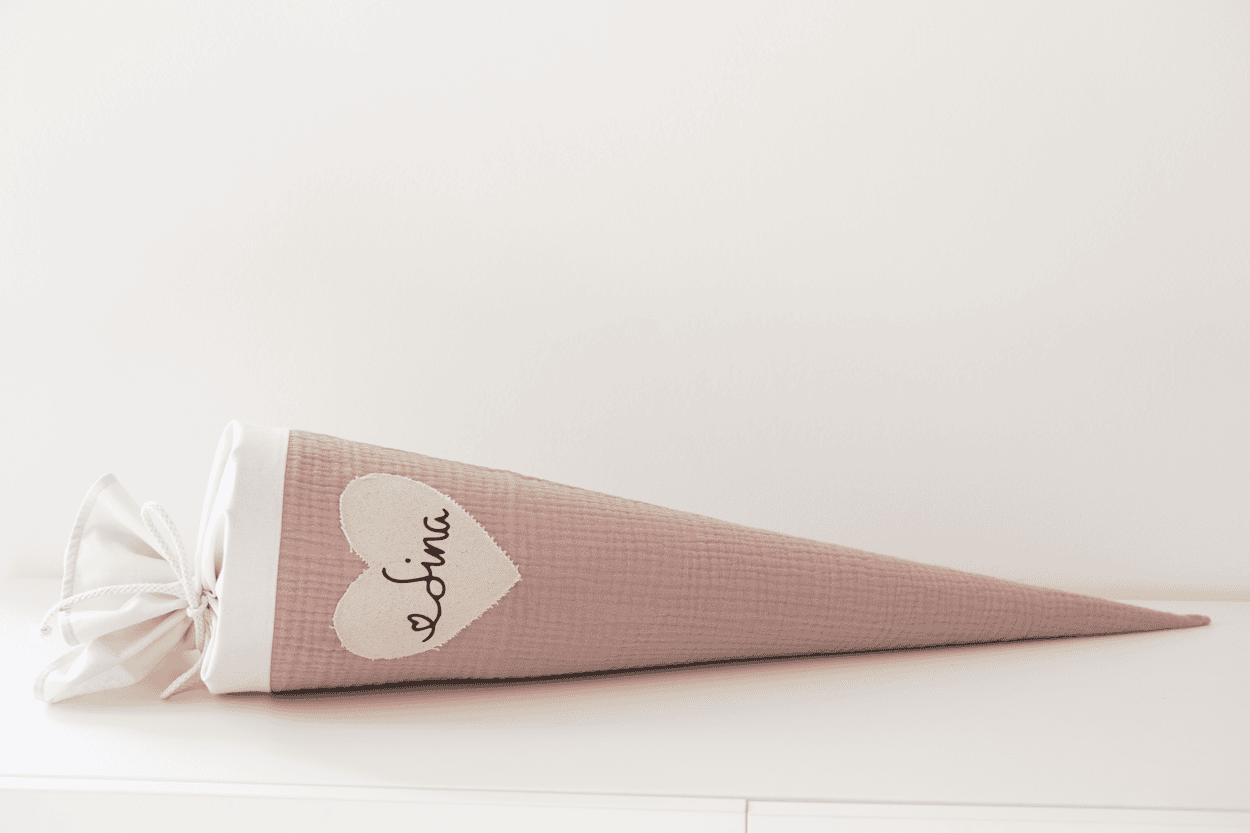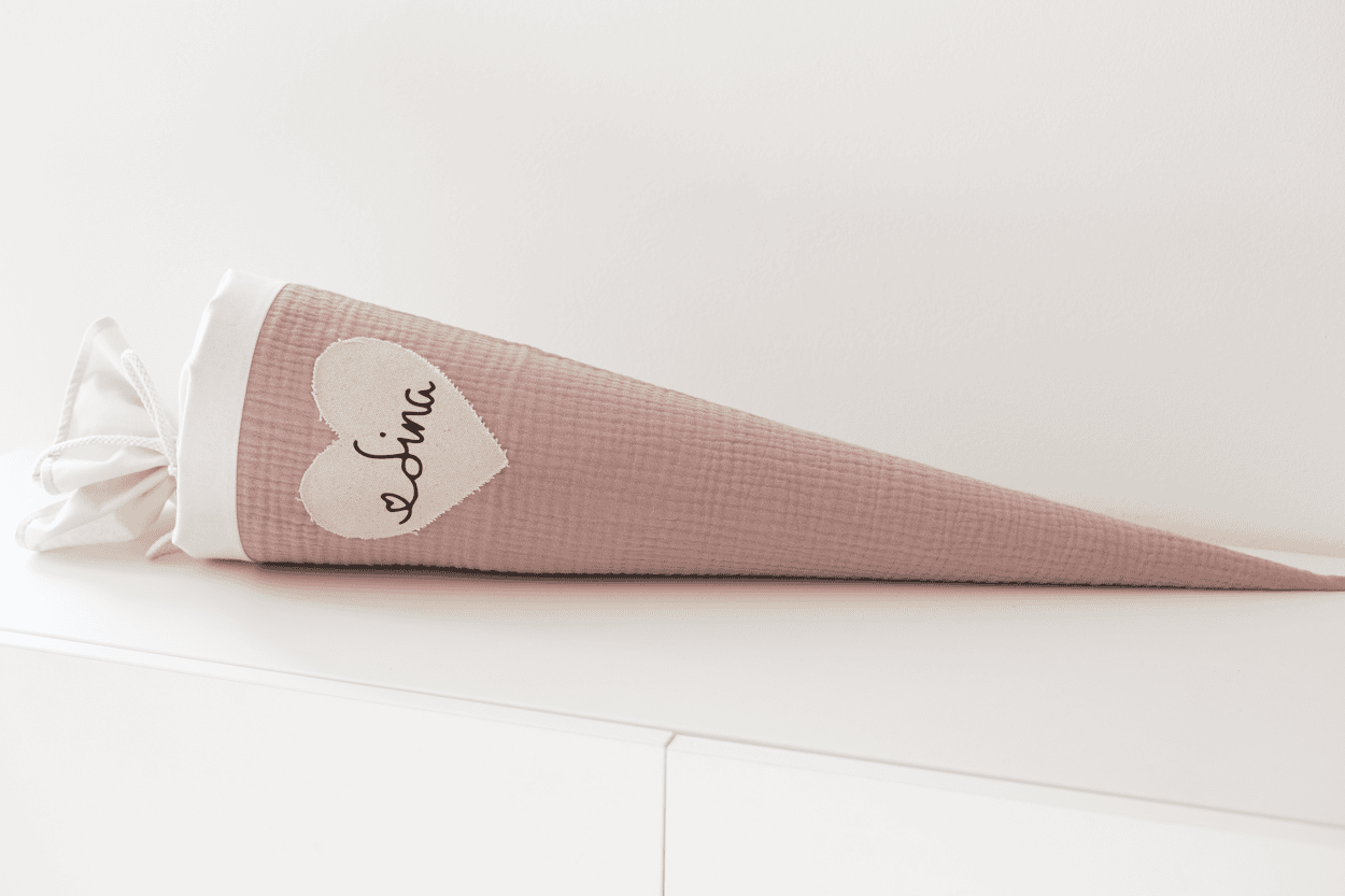 Wir nähen deine perfekte Schultüte für dein Kind. Aus weichem Musselin und Baumwollpatch mit Namensaufdruck inkl. Papierrohling. Die Farbauswahl stimmen wir mit dir persönlich ab, damit diese passend zur Büchertasche harmoniert.