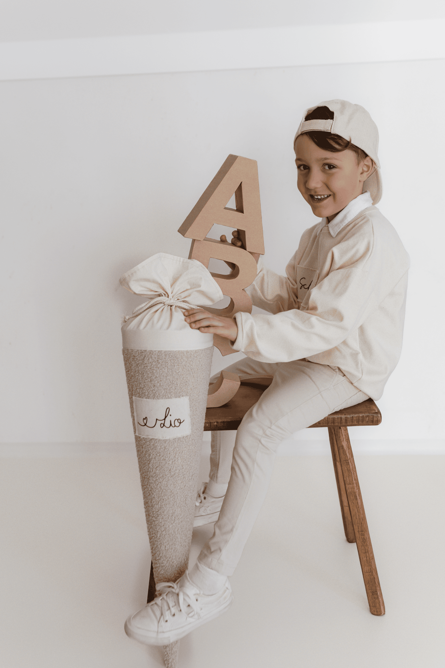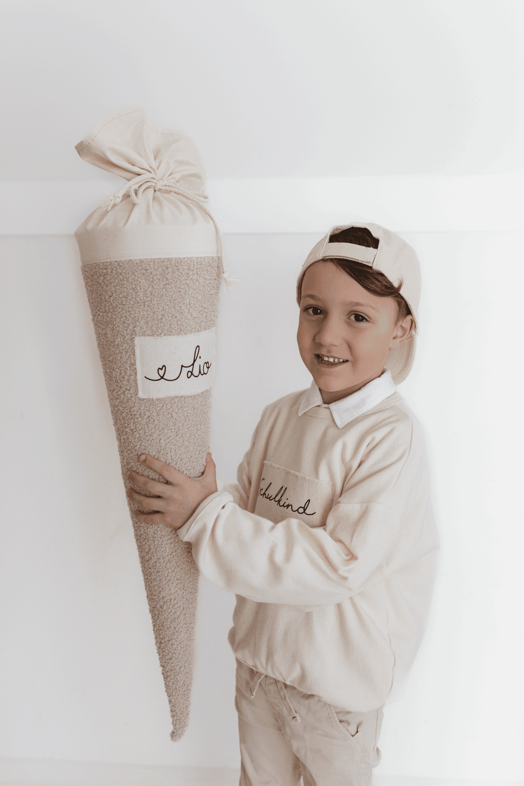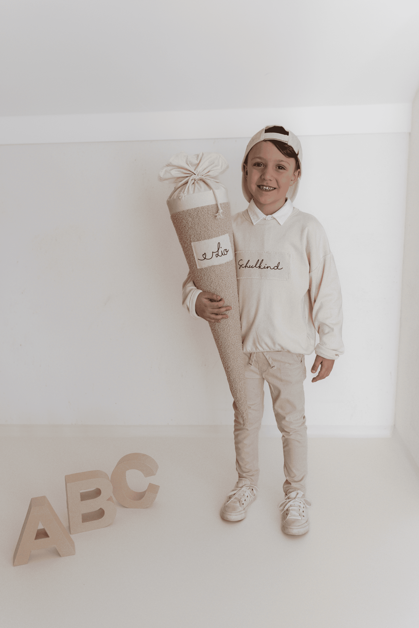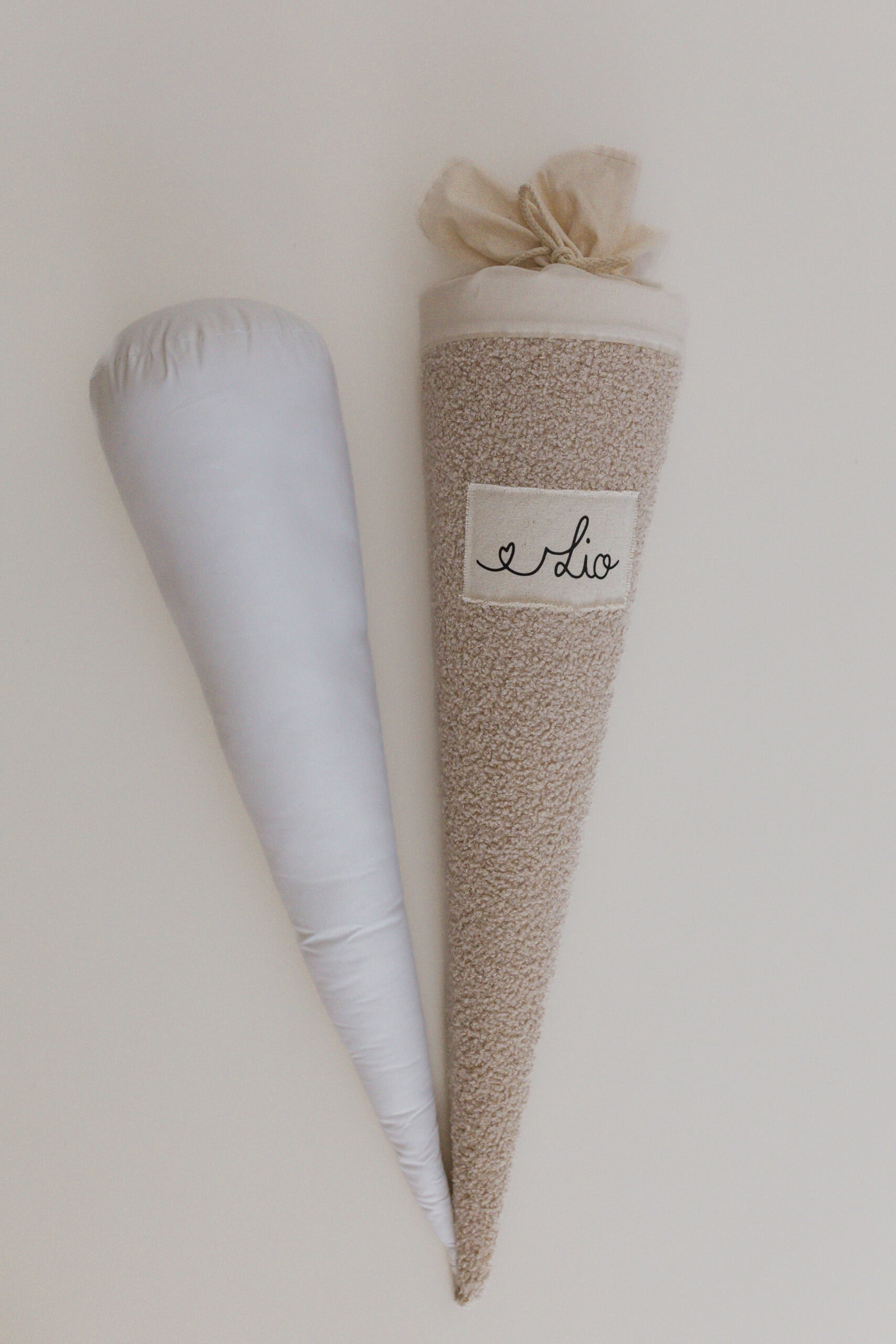 Schultüte aus weichem Teddystoff und Baumwollpatch mit Namensaufdruck inkl. Papierrohling.